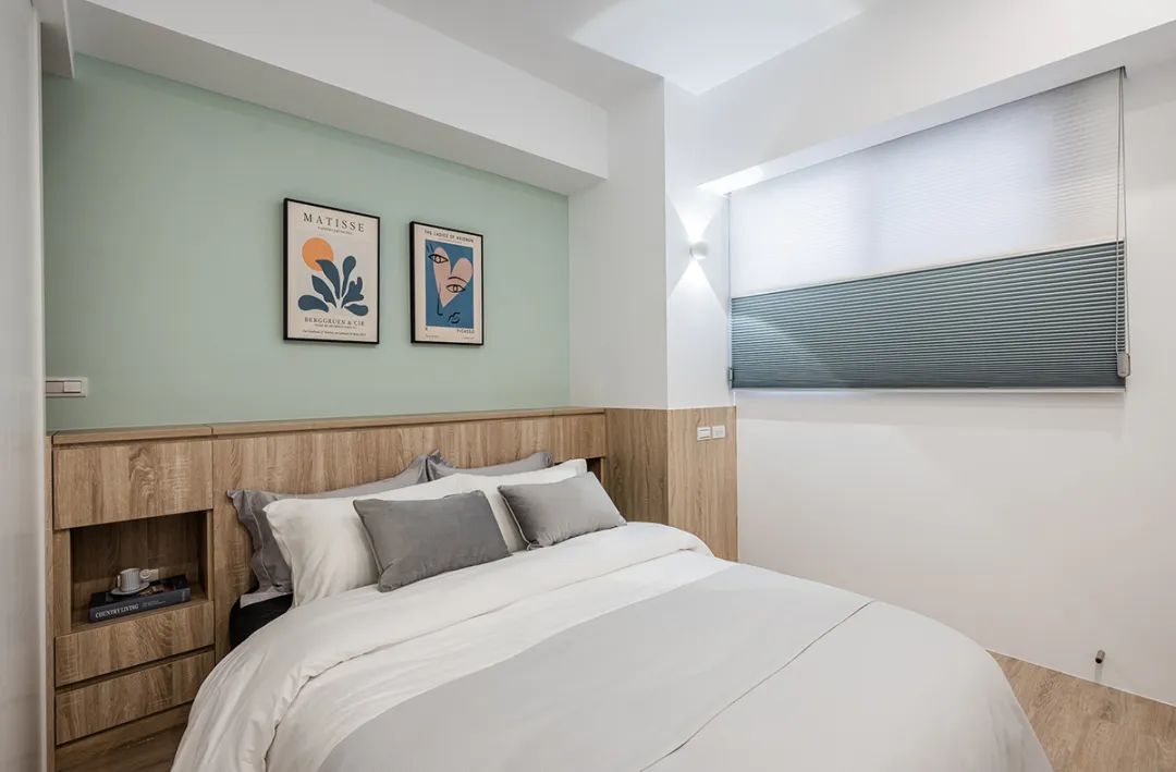 木地板上墙做半墙床头护墙板,两侧做成嵌入式的壁龛,比床头柜更节约空间。