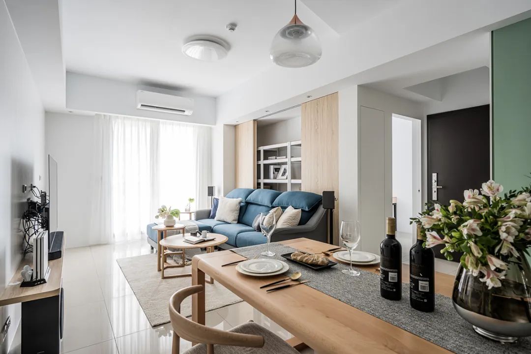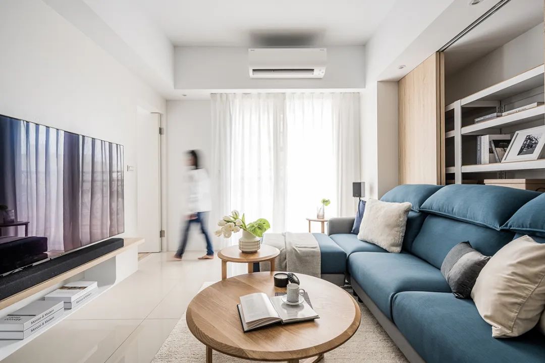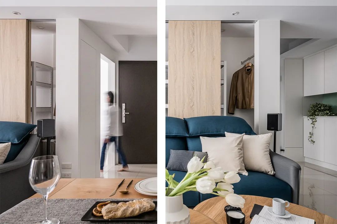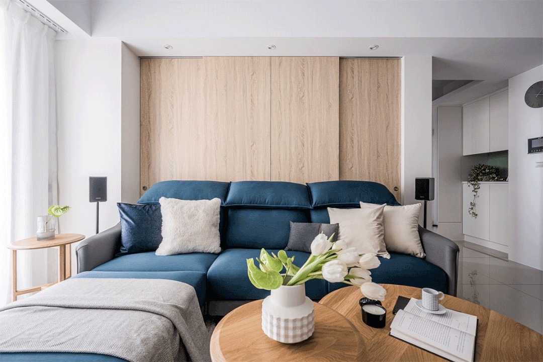 沙发后方是隐形墙,可随时开合,这样做解决了沙发上方的横梁。