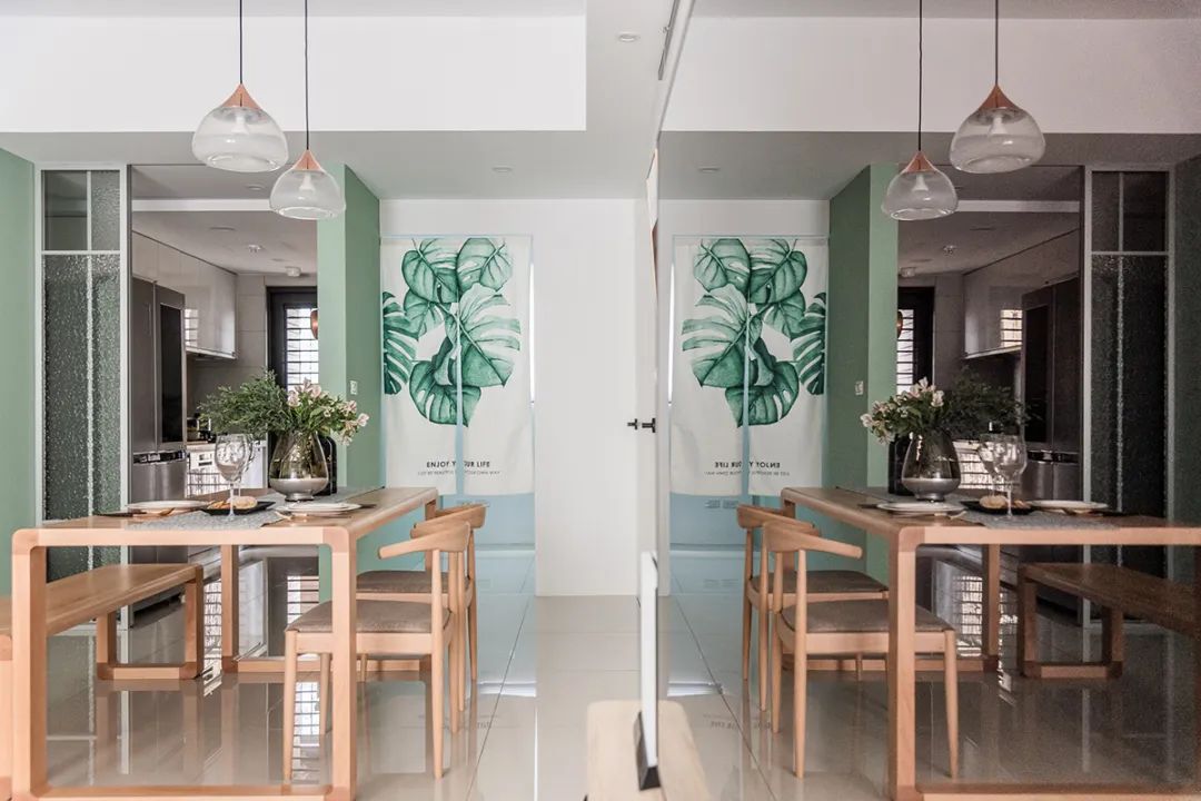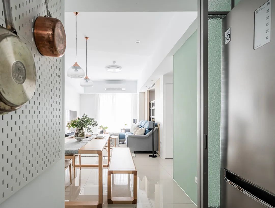 厨房正对阳台,风水上称之为穿堂煞,同时考虑到屋主喜欢爆炒的习惯,在厨房半开放的料理区增加了一扇玻璃滑门。