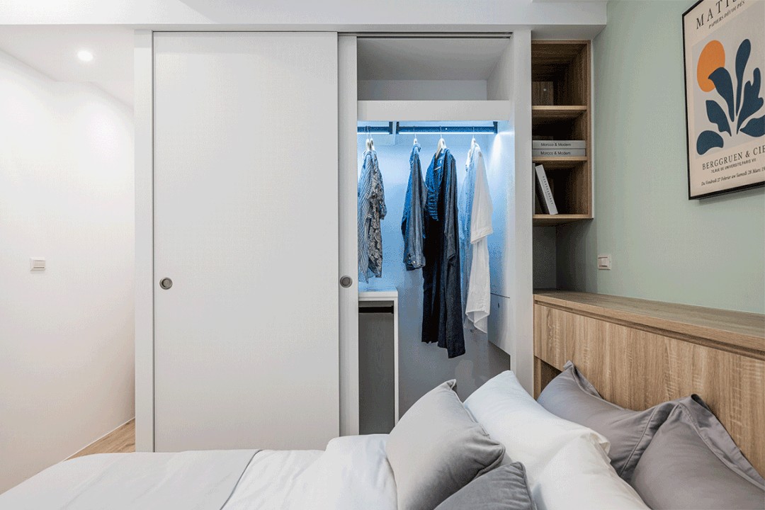 卫生间门口右侧的定制柜,可作为临时办公区,也可以当梳妆区。