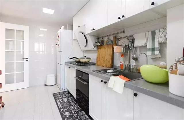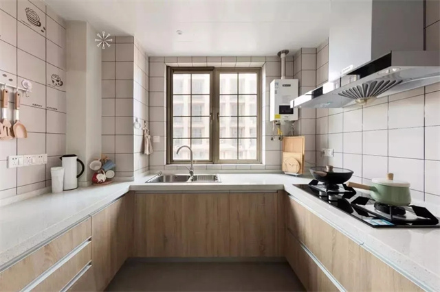有些厨房规格偏长,长方形设计的厨房可以设计成“L”型,这样设计空间利用率更高,方便加装橱柜,增加储物空间。也方便动线设计,让整个厨房操作流程更顺手。
